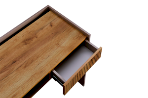 Корпус стола выполнен в цвете кашемир, что придает ему современный и спокойный вид, легко сочетающийся с любым интерьером. Выкатной ящик в цвете "дуб крафт золотой", декорирован принтом, имитирующим вертикальную фрезеровку, что добавляет столу уникальности и роскоши.